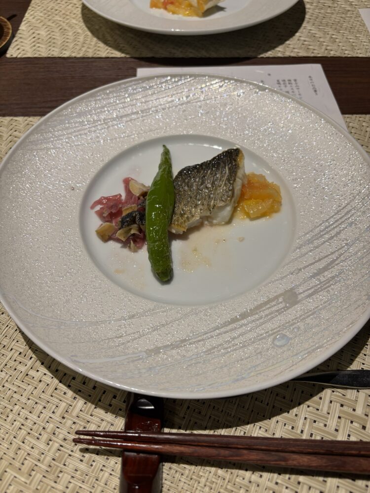 金目鯛のお造り、鱸(すずき)のボワレ、静岡県産の米(タコ飯)など、地産地消にこだわった内容でした。